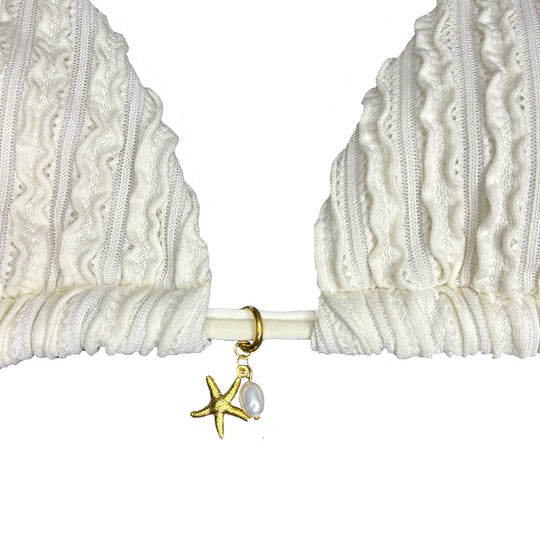 Ce bijou de maillot de bain se clipse facilement comme une boucle d’oreille. Il s’ajuste à votre convenance et se porte aussi bien sur une bretelle que délicatement placé entre la poitrine pour sublimer votre décolleté.