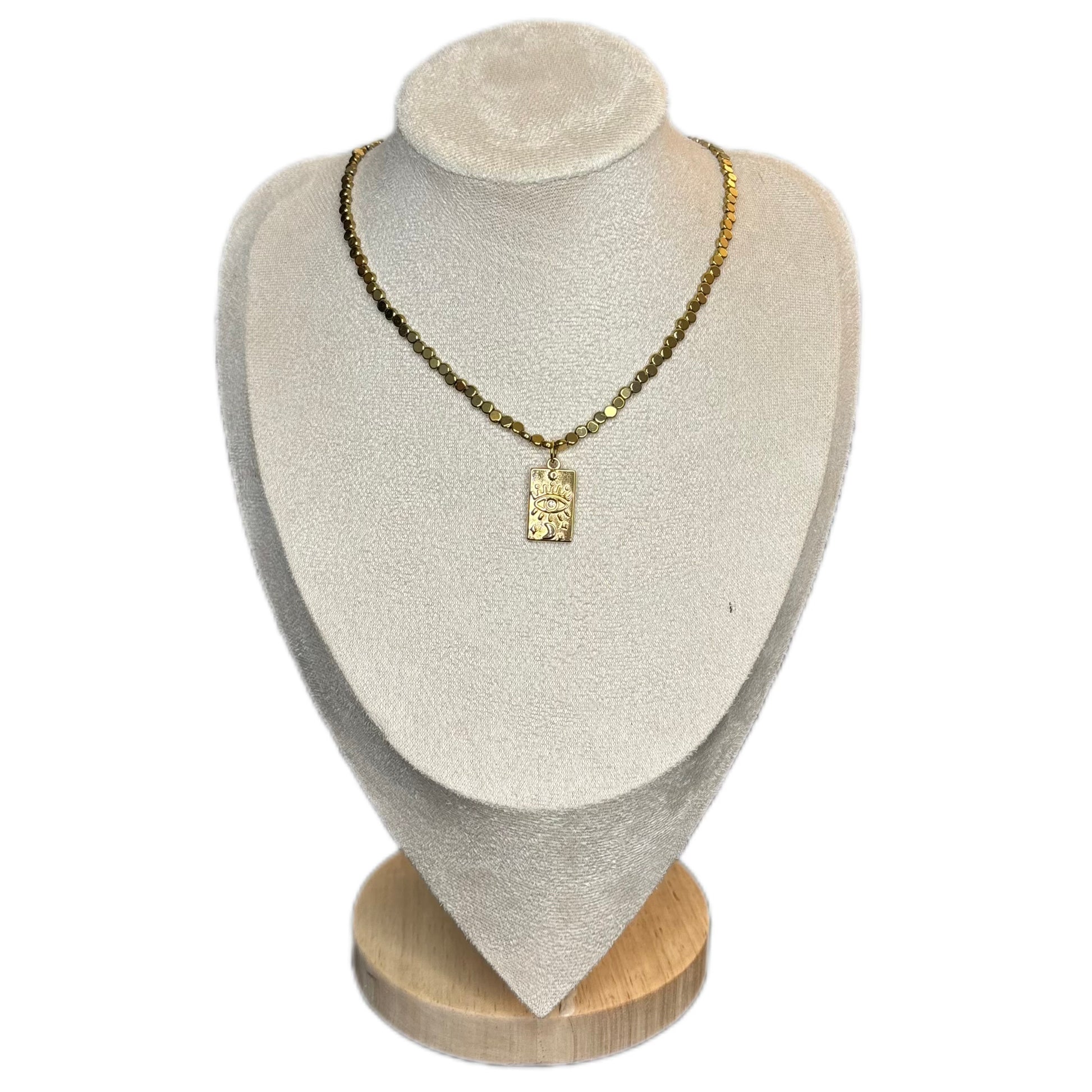 Découvrez notre collier Lisbonne en pierre d'hématite avec breloque, fait à la main.